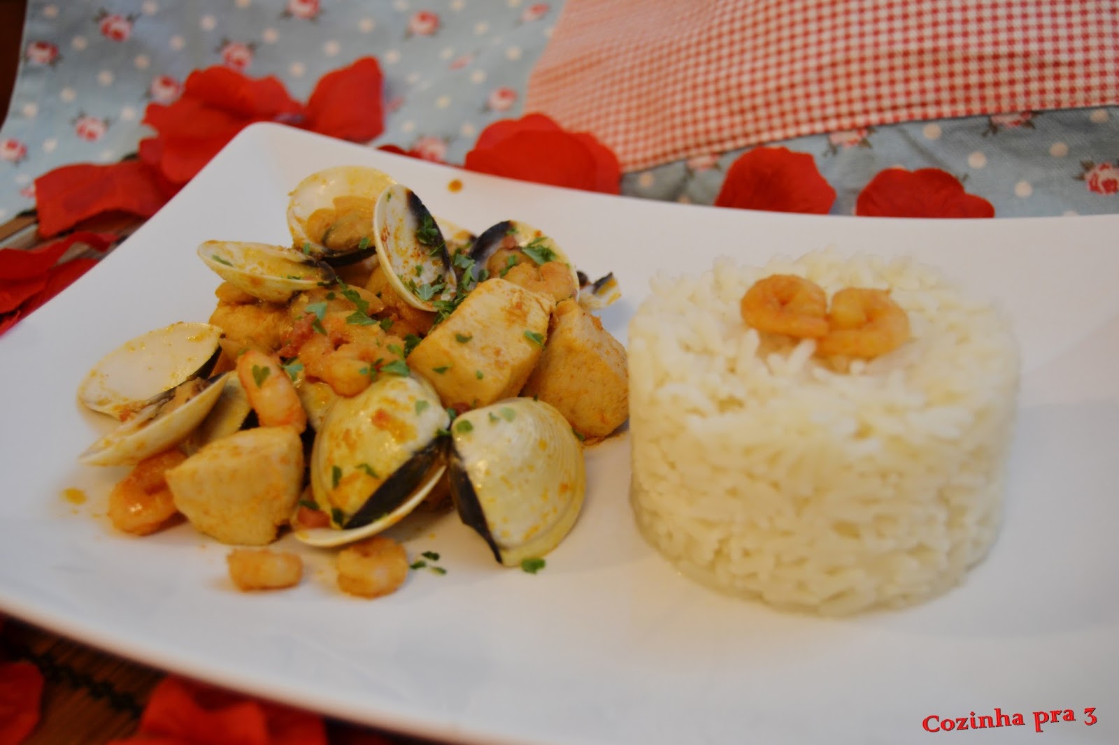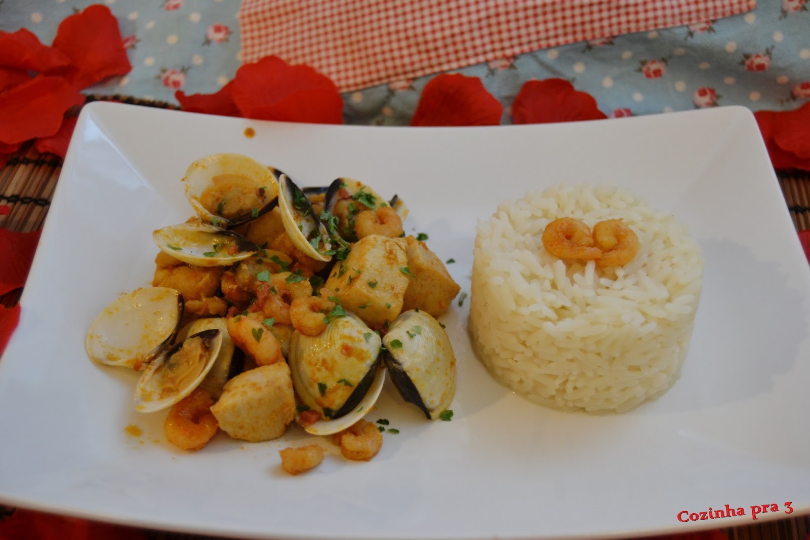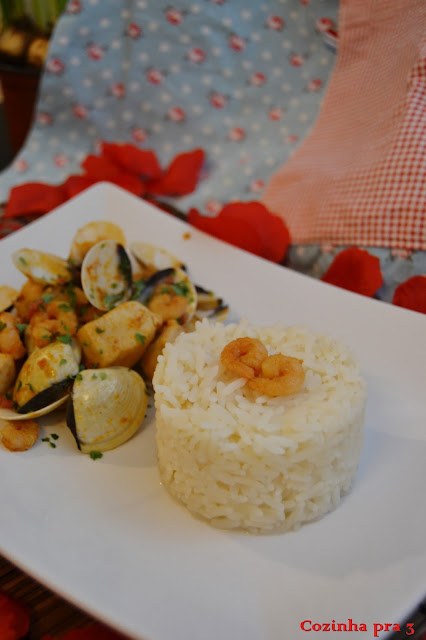 Para comemorar o dia de São Valentim decidi fazer algo diferente, um prato que leva-se carne e peixe. Decidi me pelo frango, camarão e amêijoas que acompanhei com arroz branco.