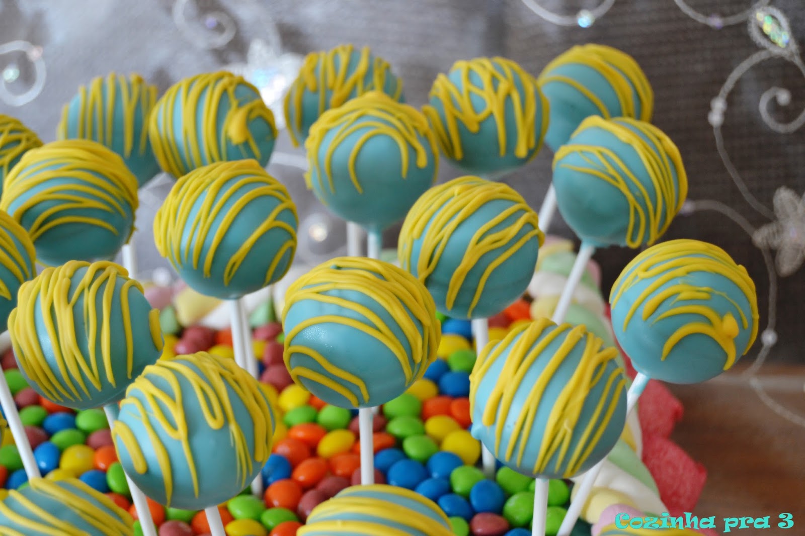 - Aqueça o chocolate Amarelo em banho maria, coloque o chocolate numa seringa própria para pastelaria e vá fazendo riscas por cima de cada cake pop. Leve-os ao frio para solidificarem bem.